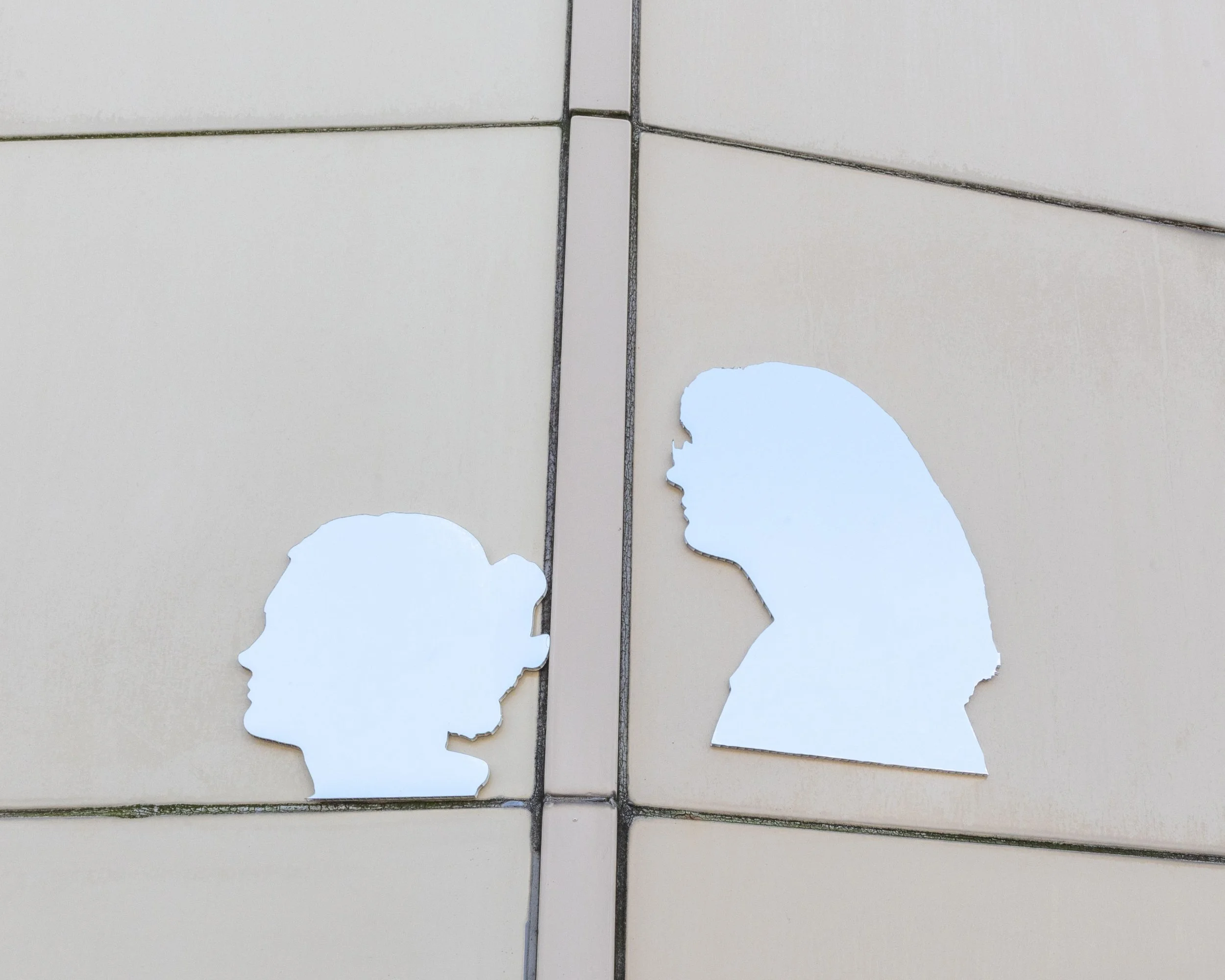 To represent the window in the structure’s original façade, Vinz created a modular system of mirrors made up of the silhouettes of local people that make it seem as if a buried layer has been extracted out onto the wall.