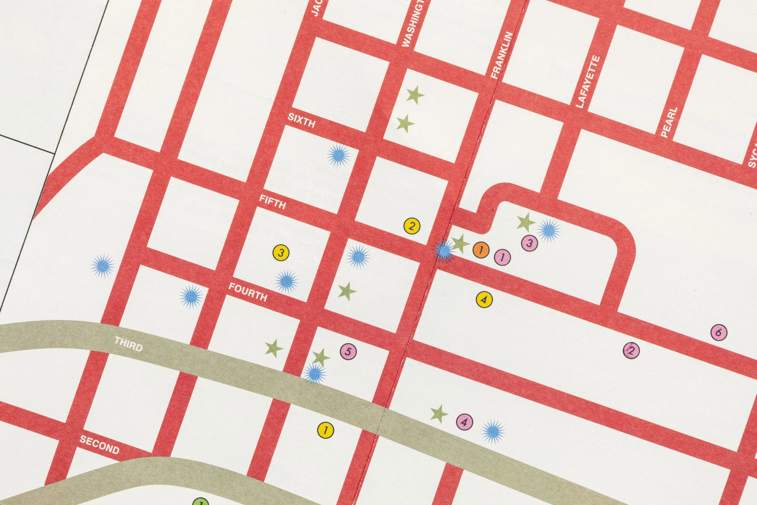 A printed map and more are available at the Columbus Area Visitor Center on 5th Street, an ideal starting point for exploring the exhibition. Sing-Sing’s thirteen unique installation animations are also on view.