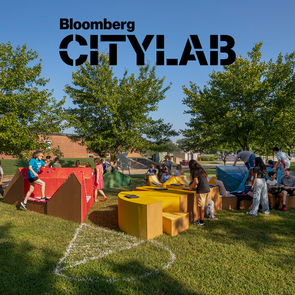 César Lopez, an architecture professor at the University of Virginia, and his fellow architecture educators Jess Myers, Amelyn Ng, and Germán Pallares-Avitia designed PUBLIC/SCHOOL/GROUNDS, which draws on the unique roofscapes of Columbus schools — Schmitt, Parkside and others — to create a series of wood outdoor classroom furniture. Arranged on the campus of Columbus’ Central Middle School, the site is simultaneously a space for learning, play, repose and exploration; reclining angles and swooping curves in bright primary colors.
